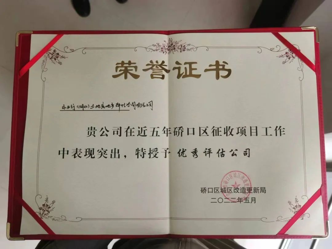 永业行获评硚口区征收项目工作优秀单位