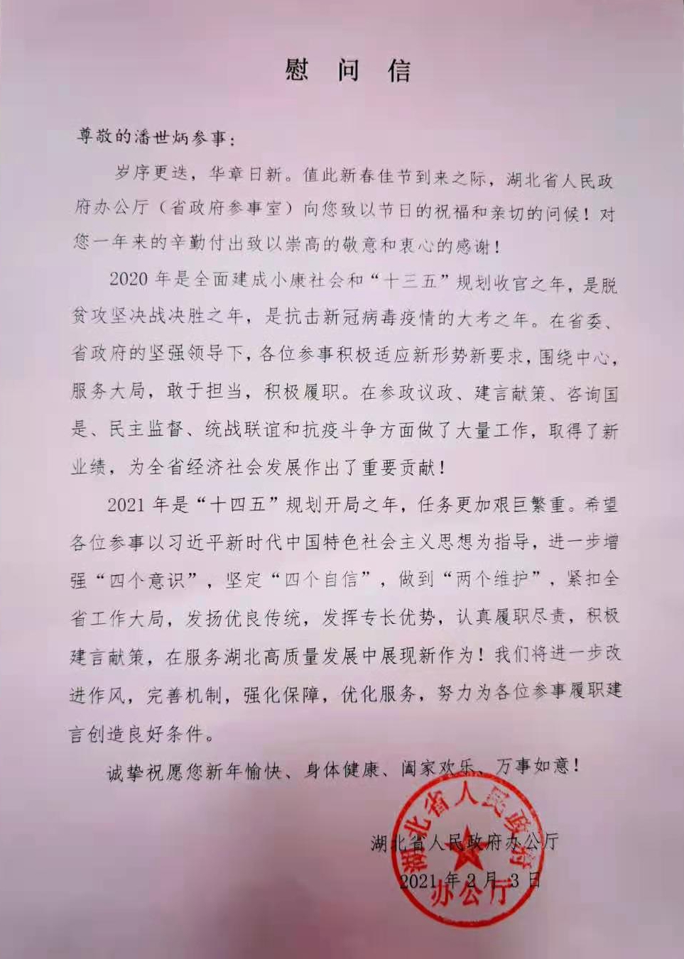 何丽君对永业行践行社会责任、贡献民企力量表示了高度赞扬,对潘世炳参事大力支持政府工作,积极参政议政、助力疫后重振的高度责任感和敬业精神表达了衷心的感谢。潘世炳表示,永业行将继续发挥专业优势,把握新阶段,应对新挑战,实现新跨越,以专业的技术和高效的服务,为经济社会高质量发展献智献力;同时,自身也将认真履职尽责,积极建言献策,在服务湖北高质量发展中展现新作为。